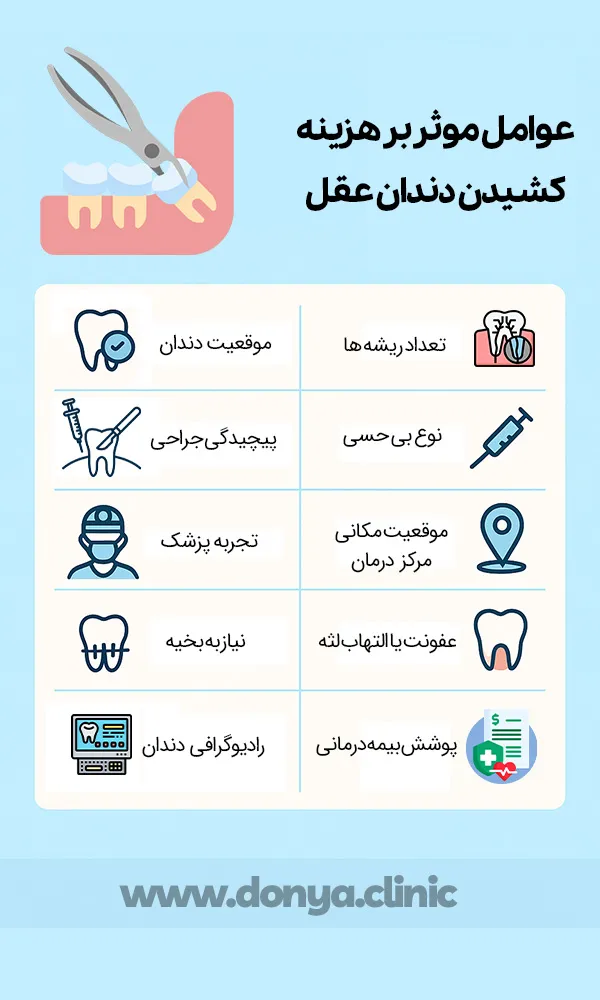 این عوامل تنها بخشی از مواردی هستند که می توانند بر هزینه کشیدن دندان عقل تاثیر بگذارند. برای اطلاع دقیق تر از هزینه ها، تماس با کلینیک یا مشورت با دندانپزشک و بررسی پوشش بیمه ای خود توصیه می شود.